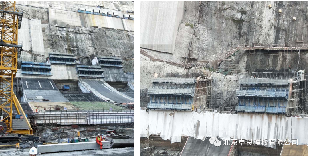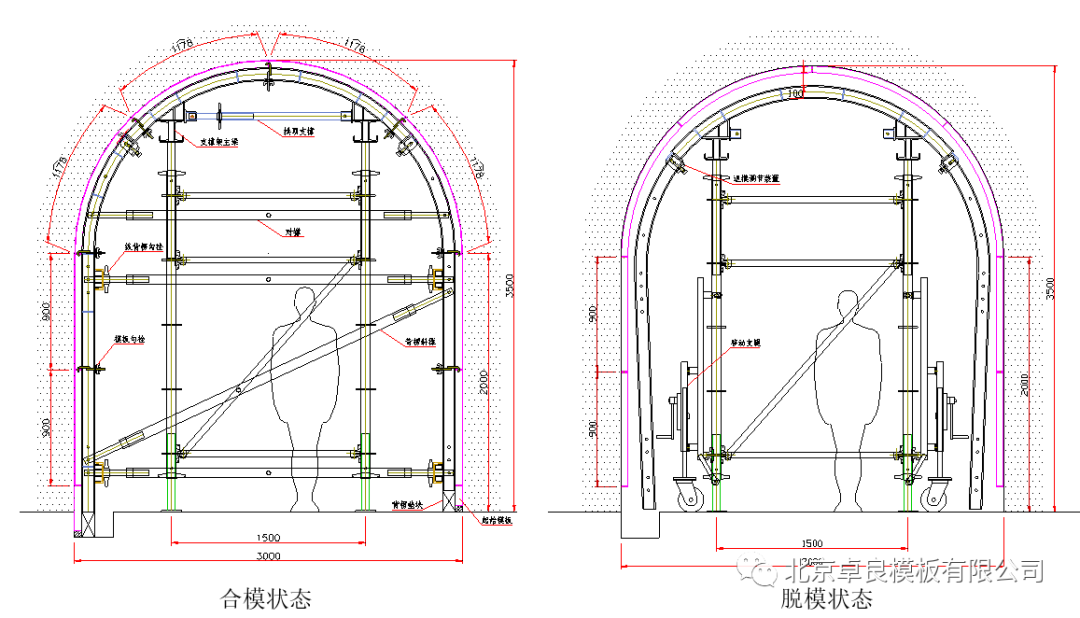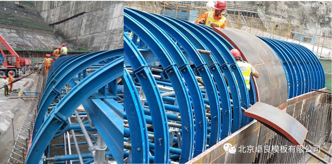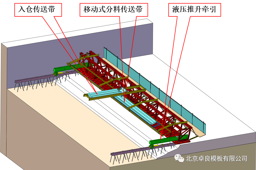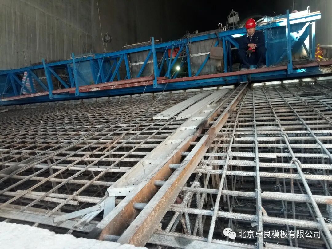 3、泄洪洞液压行走拖模:模板宽度1.5米,液压爬升方式,后设抹面平台。