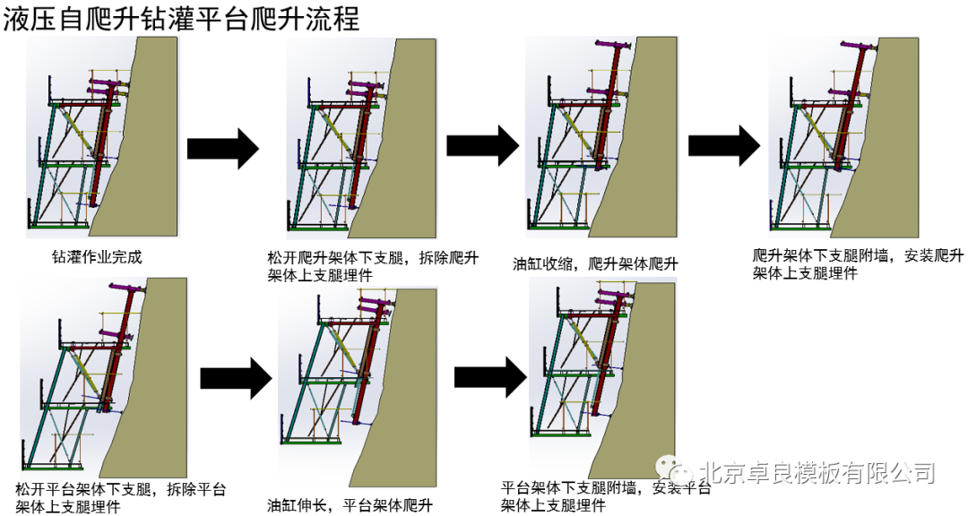 2、坝肩自爬升钻灌平台:在不规则岩石基面爬升适应连续变化的倾角爬升平台规范、安全。