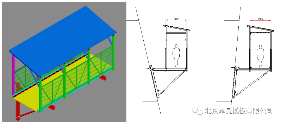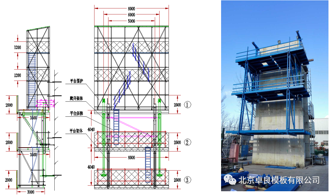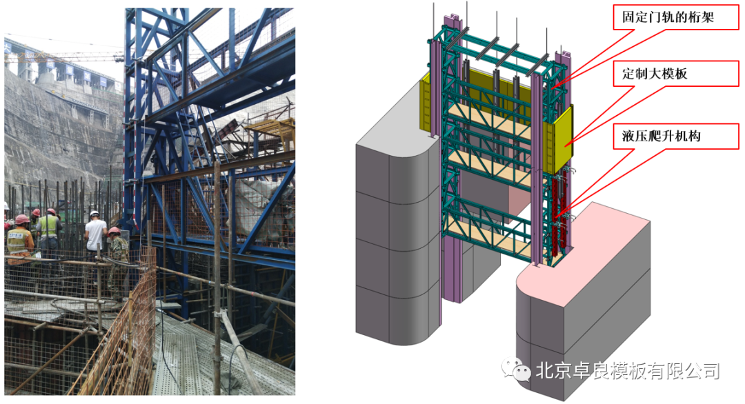 5、门槽自爬升台车:可以用于直门槽,也可用于斜门槽,定制大模板,与爬升系统同时爬升。