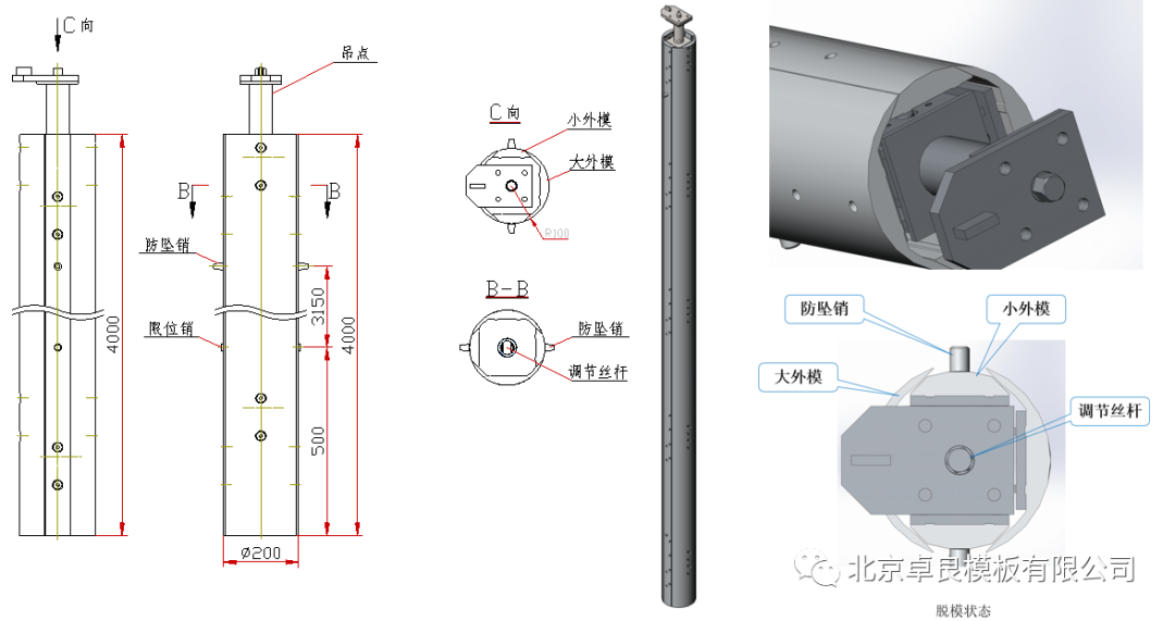 4、伸缩拔管:小直径排水孔模板适用直径200mm,拆模时,拧转上端机构,直径变小。